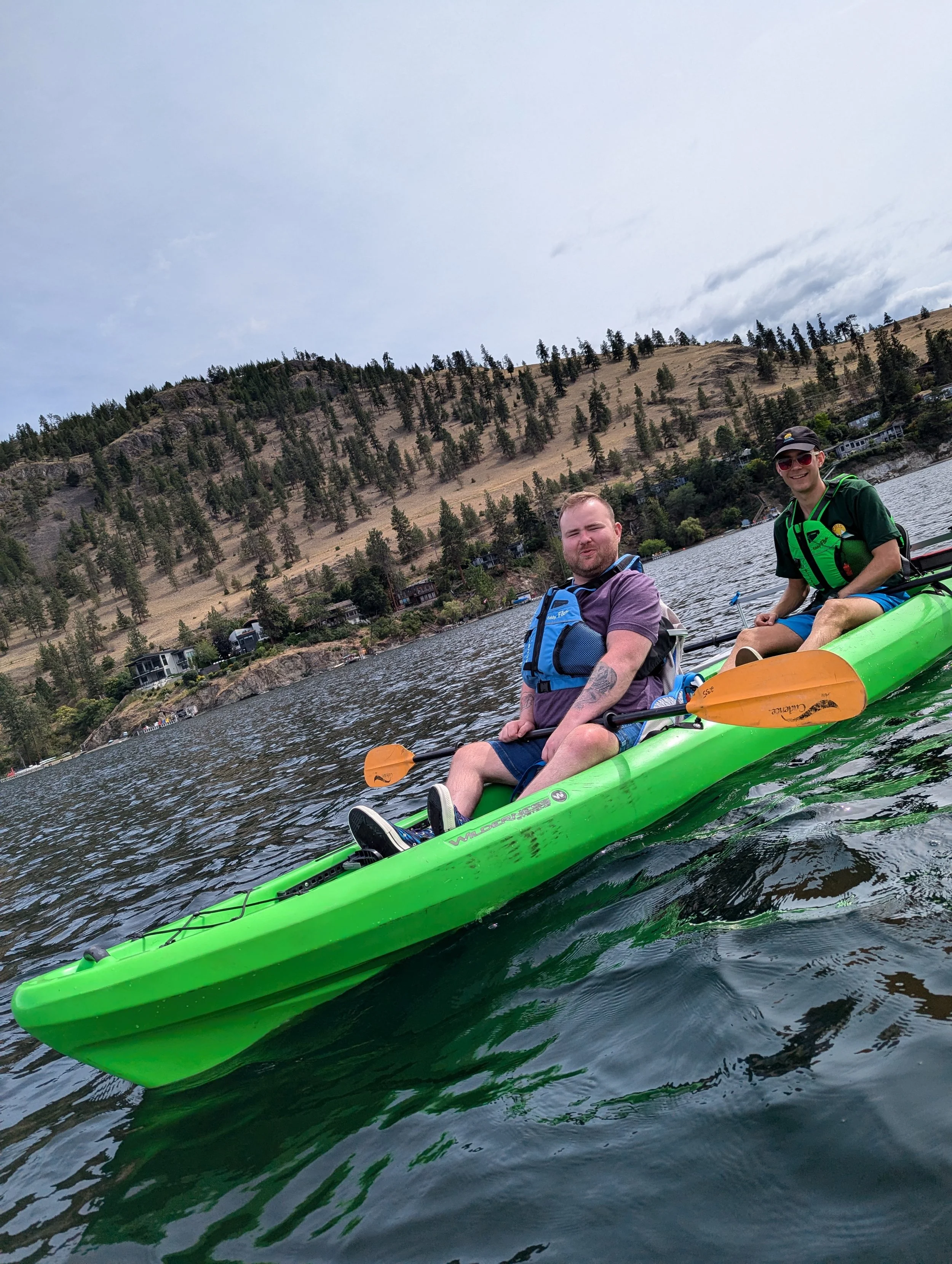 The big day finally rolled around, but before I could rock out, I had a date with a kayak, courtesy of CRIS Adaptive Adventures. So, my care-aide Shae and I hit the road to Kelowna, where we rendezvoused with the CRIS crew. We were fashionably late—just a casual ten minutes—but by the time we arrived, the kayaks were set up and waiting, just for me. I was assigned to a tandem kayak with one of the CRIS team members, who turned out to be Joel, one of Shae’s high school pals. Small world, right? The beach was dotted with about five other kayaks, setting the stage for a lake adventure with quite the crew.